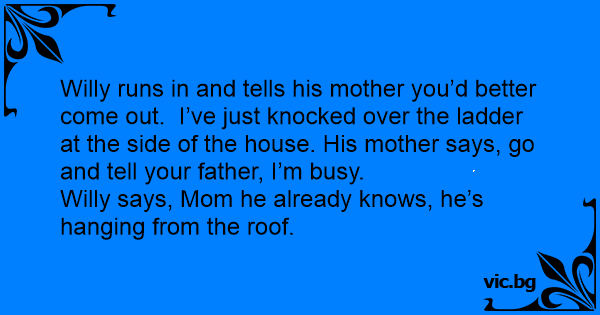 Willy runs in and tells his mother you’d better come out. I’ve just knocked over the ladder at the side of the house. His mother says, go and tell your father, I’m busy.