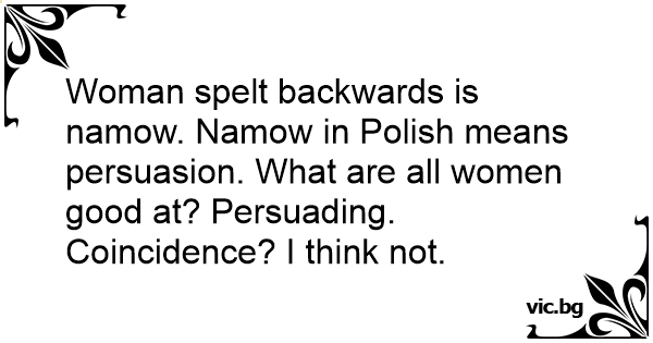 Woman spelt backwards is namow. Namow in Polish means persuasion. What are all women good at? Persuading. Coincidence? I think not.