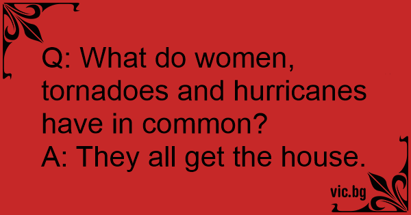 Q: How are women and a hurricane alike? A: When they arrive they're both wet and wild, when they leave, they take your house and your car.