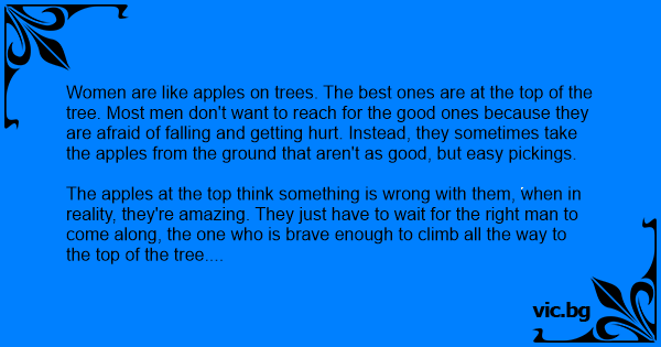 The apples at the top think something is wrong with them, when in reality, they're amazing. They just have to wait for the right man to come along, the one who is brave enough to climb all the way to the top of the tree.