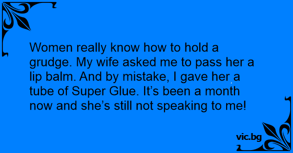 Women really know how to hold a grudge. My wife asked me to pass her a lip balm. And by mistake, I gave her a tube of Super Glue. It’s been a month now and she’s still not speaking to me!