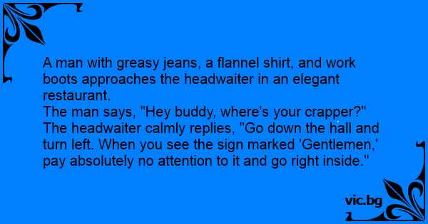 The headwaiter calmly replies, "Go down the hall and turn left. When you see the sign marked 'Gentlemen,' pay absolutely no attention to it and go right inside."
