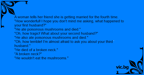 - Hur dog din första man! - Han åt giftig svamp. - Hur dog din andra man? - Han åt giftig svamp. - Hur dog din tredje man? - Honom slog jag ihjäl - Varför det? - Han vägrade äta min...