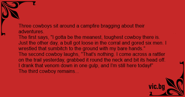 The second cowboy laughs, "That's nothing. I come across a rattler on the trail yesterday, grabbed it round the neck and bit its head off. I drank that venom down in one gulp, and I'm still here today!"