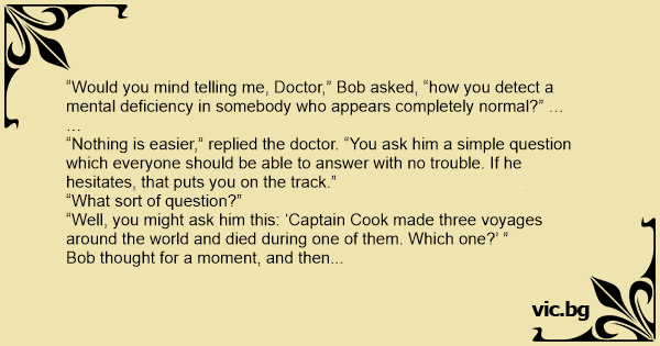 “Would you mind telling me, Doctor,” Bob asked, “how you detect a mental deficiency in somebody who appears completely normal?” …