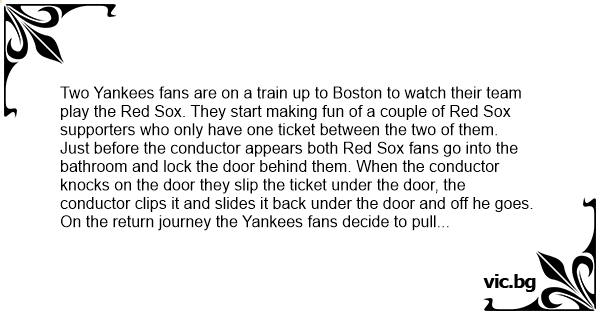 On the return journey the Yankees fans decide to pull the same trick and purchase only one ticket for the two of them. They notice that yet again the two Red Sox supporters only have one ticket between them. The Yankees fans realize there is only one bathroom per carriage and quickly take the lead, locking themselves in first, leaving the Red Sox fans with nowhere to go.