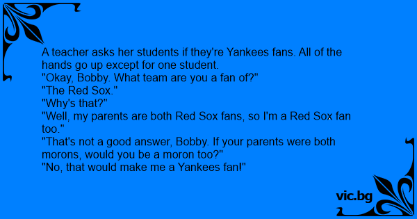 A teacher asks her students if they're Yankees fans. All of the hands go up except for one student.