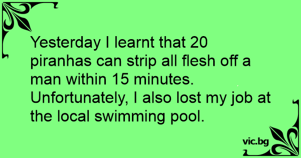 - Вчера я выяснил, что 20 пираний могут полностью обглодать человека за 15 минут. И еще я потерял работу в бассейне...