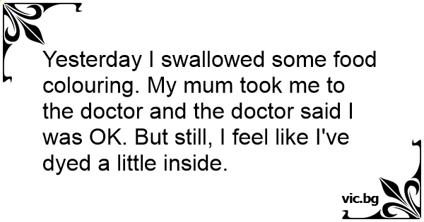 Yesterday I swallowed some food colouring. My mum took me to the doctor and the doctor said I was OK. But still, I feel like I've dyed a little inside.