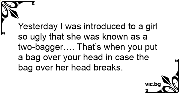 Yesterday I was introduced to a girl so ugly that she was known as a two-bagger…. That’s when you put a bag over your head in case the bag over her head breaks.