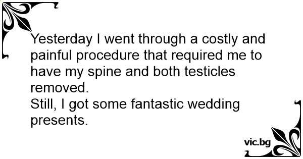 Yesterday I went through a costly and painful procedure that required me to have my spine and both testicles removed.