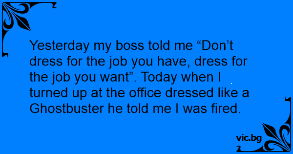 Yesterday my boss told me “Don’t dress for the job you have, dress for the job you want”. Today when I turned up at the office dressed like a Ghostbuster he told me I was fired.