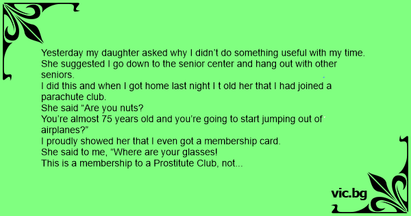Yesterday my daughter asked why I didn’t do something useful with my time. She suggested I go down to the senior center and hang out with other seniors. I did this and when I got home last night I t old her that I had joined a parachute club. She said “Are you nuts? You’re almost 75 years old and you’re going to start jumping out of airplanes?” I proudly showed her that I even got a membership card. She said to me, “Where are your glasses! This is a membership to a Рrоsтiтuте Club, not a Parachute Club!” I’m in trouble again and don’t know what to do! I signed up for five jumps a week! Life as a senior citizen is not getting any easier.