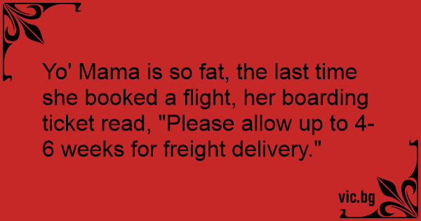 Yo' Mama is so fат, the last time she booked a flight, her boarding ticket read, "Please allow up to 4-6 weeks for freight delivery."