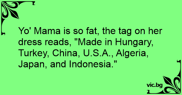 Yo' Mama is so fат, the tag on her dress reads, "Made in Hungary, Turkey, China, U.S.A., Algeria, Japan, and Indonesia."