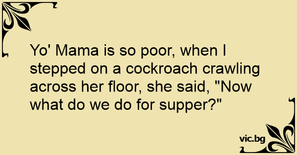 Yo' Mama is so poor, when I stepped on a cockroach crawling across her floor, she said, "Now what do we do for supper?"