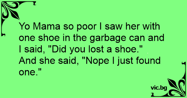 Yo Mama so poor I saw her with one shoe in the garbage can and I said, "Did you lost a shoe."