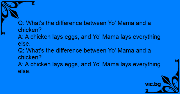 A: A chicken lays eggs, and Yo' Mama lays everything else.
