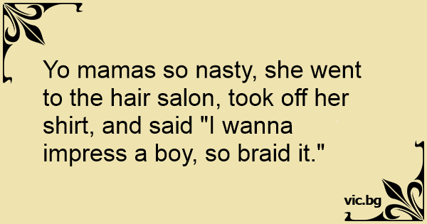 Yo mamas so nasty, she went to the hair salon, took off her shirt, and said "I wanna impress a boy, so braid it."
