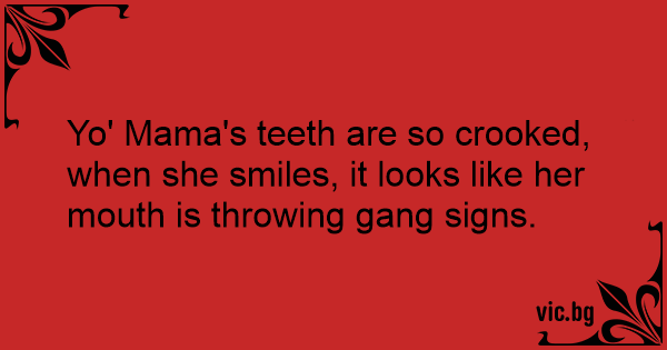 Yo' Mama's teeth are so crooked, when she smiles, it looks like her mouth is throwing gang signs.