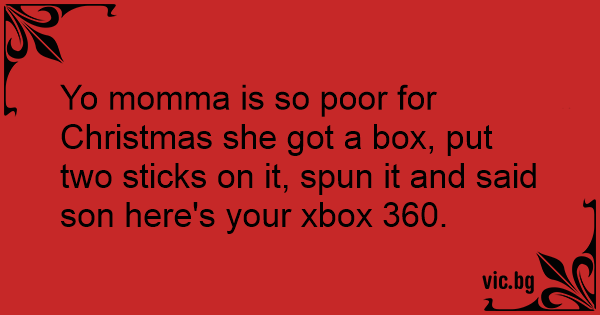 Yo momma is so poor for Christmas she got a box, put two sticks on it, spun it and said son here's your xbox 360.