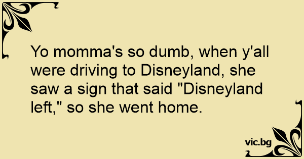 Yo momma's so dumb, when y'all were driving to Disneyland, she saw a sign that said "Disneyland left," so she went home.