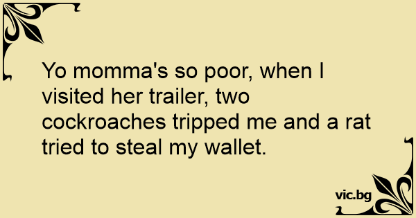 Yo momma's so poor, when I visited her trailer, two cockroaches tripped me and a rat tried to steal my wallet.