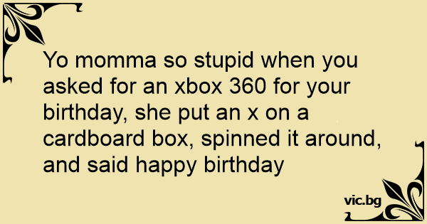 Yo momma so sтuрid when you asked for an xbox 360 for your birthday, she put an x on a cardboard box, spinned it around, and said happy birthday