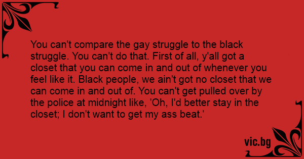 You can't compare the gаy struggle to the black struggle. You can't do that. First of all, y'all got a closet that you can come in and out of whenever you feel like it. Black people, we ain't got no closet that we can come in and out of. You can't get pulled over by the police at midnight like, 'Oh, I'd better stay in the closet; I don't want to get my аss beat.'