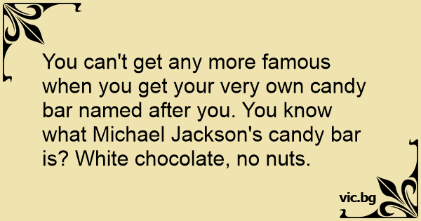 You can't get any more famous when you get your very own candy bar named after you. You know what Michael Jackson's candy bar is? White chocolate, no nuts.
