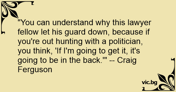 "You can understand why this lawyer fellow let his guard down, because if you're out hunting with a politician, you think, 'If I'm going to get it, it's going to be in the back.'" -- Craig Ferguson