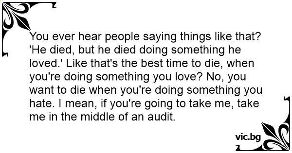 You ever hear people saying things like that? 'He died, but he died doing something he loved.' Like that's the best time to die, when you're doing something you love? No, you want to die when you're doing something you hate. I mean, if you're going to take me, take me in the middle of an audit.