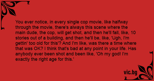 You ever notice, in every single cop movie, like halfway through the movie, there's always this scene where the main dude, the cop, will get shot, and then he'll fall, like, 10 stories out of a building, and then he'll be, like, 'Ugh, I'm gettin' too old for this'? And I'm like, was there a time where that was OK? I think that's bad at any point in your life. Has anybody ever been shot and been like, 'Oh my god! I'm exactly the right age for this.'