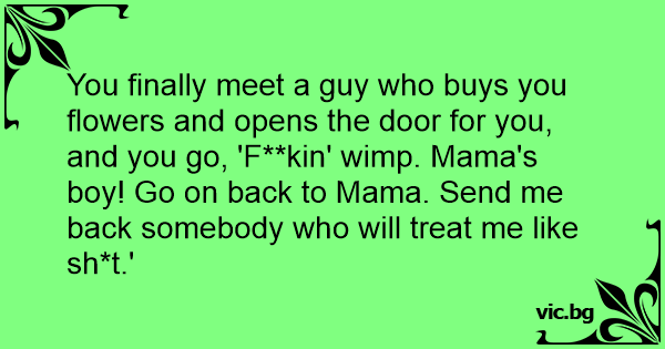 You finally meet a guy who buys you flowers and opens the door for you, and you go, 'F**kin' wimp. Mama's boy! Go on back to Mama. Send me back somebody who will treat me like sh*t.'