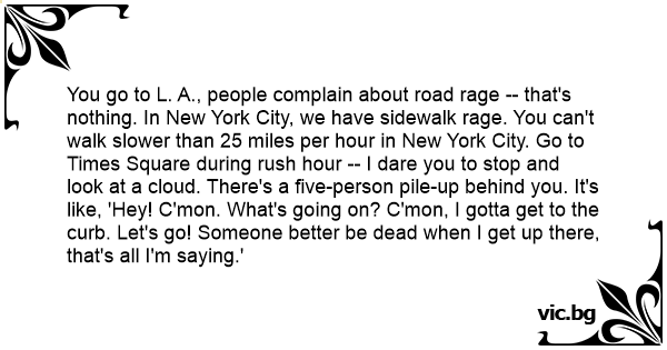 You go to L. A., people complain about road rage -- that's nothing. In New York City, we have sidewalk rage. You can't walk slower than 25 miles per hour in New York City. Go to Times Square during rush hour -- I dare you to stop and look at a cloud. There's a five-person pile-up behind you. It's like, 'Hey! C'mon. What's going on? C'mon, I gotta get to the curb. Let's go! Someone better be dead when I get up there, that's all I'm saying.'