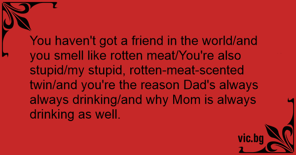 You haven't got a friend in the world/and you smell like rotten meat/You're also sтuрid/my sтuрid, rotten-meat-scented twin/and you're the reason Dad's always always drinking/and why Mom is always drinking as well.