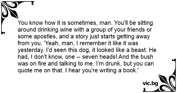 You know how it is sometimes, man. You'll be sitting around drinking wine with a group of your friends or some apostles, and a story just starts getting away from you. 'Yeah, man, I remember it like it was yesterday. I'd seen this dog, it looked like a beast. He had, I don't know, one -- seven heads! And the bush was on fire and talking to me. I'm drunк, but you can quote me on that. I hear you're writing a book.'
