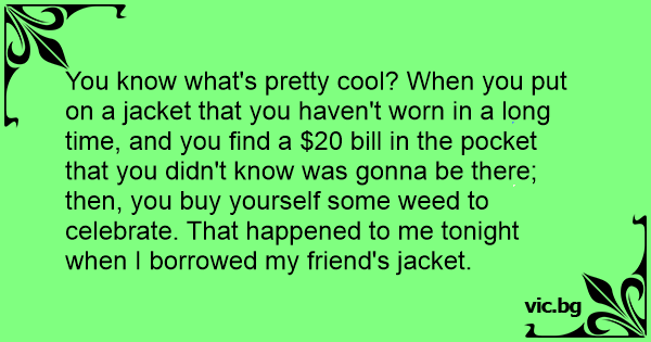 You know what's pretty cool? When you put on a jacket that you haven't worn in a long time, and you find a $20 bill in the pocket that you didn't know was gonna be there; then, you buy yourself some wееd to celebrate. That happened to me tonight when I borrowed my friend's jacket.