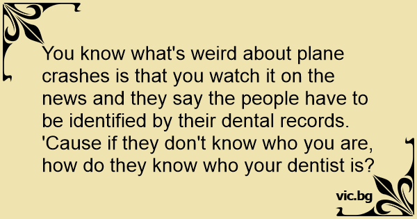 You know what's weird about plane crashes is that you watch it on the news and they say the people have to be identified by their dental records. 'Cause if they don't know who you are, how do they know who your dentist is?