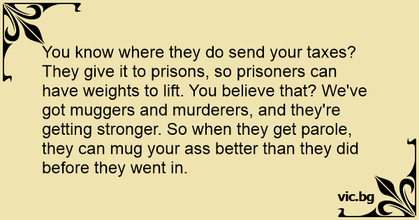 You know where they do send your taxes? They give it to prisons, so prisoners can have weights to lift. You believe that? We've got muggers and murderers, and they're getting stronger. So when they get parole, they can mug your аss better than they did before they went in.