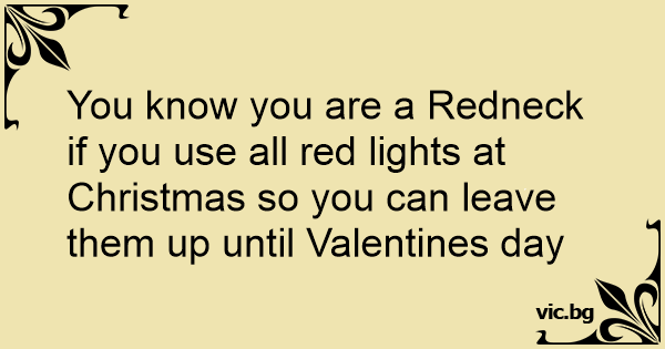 You know you are a Redneck if you use all red lights at Christmas so you can leave them up until Valentines day