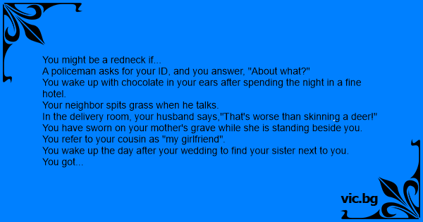 You might be a redneck if... A policeman asks for your ID, and you answer, "About what?" You wake up with chocolate in your ears after spending the night in a fine hotel. Your neighbor spits grass when he talks. In the delivery room, your husband says,"That's worse than skinning a deer!" You have sworn on your mother's grave while she is standing beside you. You refer to your cousin as "my girlfriend". You wake up the day after your wedding to find your sister next to you. You got your tater gun hangin' over your couch in your living room as a conversation piece. You've ever entered yourself in a "Howdy Doody Look-alike" Contest. Your lips move while reading a stop sign.