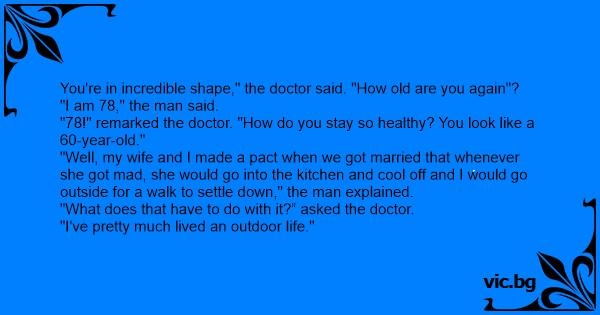 "78!" remarked the doctor. "How do you stay so healthy? You look like a 60-year-old."