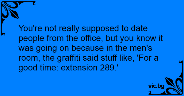 You're not really supposed to date people from the office, but you know it was going on because in the men's room, the graffiti said stuff like, 'For a good time: extension 289.'