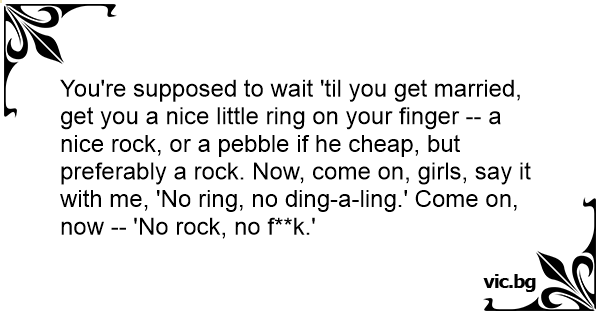 You're supposed to wait 'til you get married, get you a nice little ring on your finger -- a nice rock, or a pebble if he cheap, but preferably a rock. Now, come on, girls, say it with me, 'No ring, no ding-a-ling.' Come on, now -- 'No rock, no f**k.'