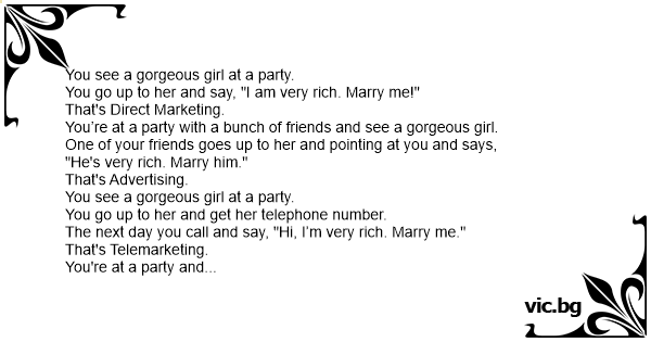 The next day you call and say, "Hi, I’m very rich. Marry me."