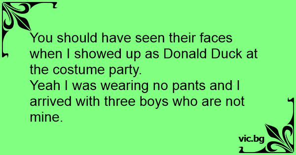 You should have seen their faces when I showed up as Donald Duck at the costume party.