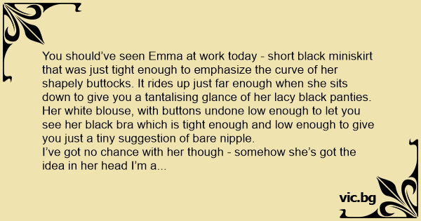You should’ve seen Emma at work today - short black miniskirt that was just tight enough to emphasize the curve of her shapely buttocks. It rides up just far enough when she sits down to give you a tantalising glance of her lacy black раnтiеs. Her white blouse, with buttons undone low enough to let you see her black вrа which is tight enough and low enough to give you just a tiny suggestion of bare niррlе.