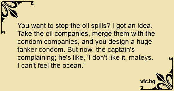 You want to stop the oil spills? I got an idea. Take the oil companies, merge them with the соndом companies, and you design a huge tanker соndом. But now, the captain's complaining; he's like, 'I don't like it, mateys. I can't feel the ocean.'