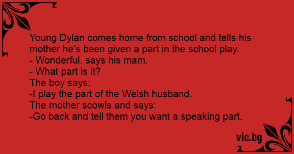 Малкият Иванчо се прибира и от вратата вика: Млад актер ја добил првата улога и му се јавува на својот татко: Der junge Schauspieler verkündet stolz, er habe jetzt seine erste Rolle erhalten: "Ich spiele einen Ehemann, der seit 25 Jahren verheiratet ist." "Nicht schlecht für den Anfang", meint sein Vater,...